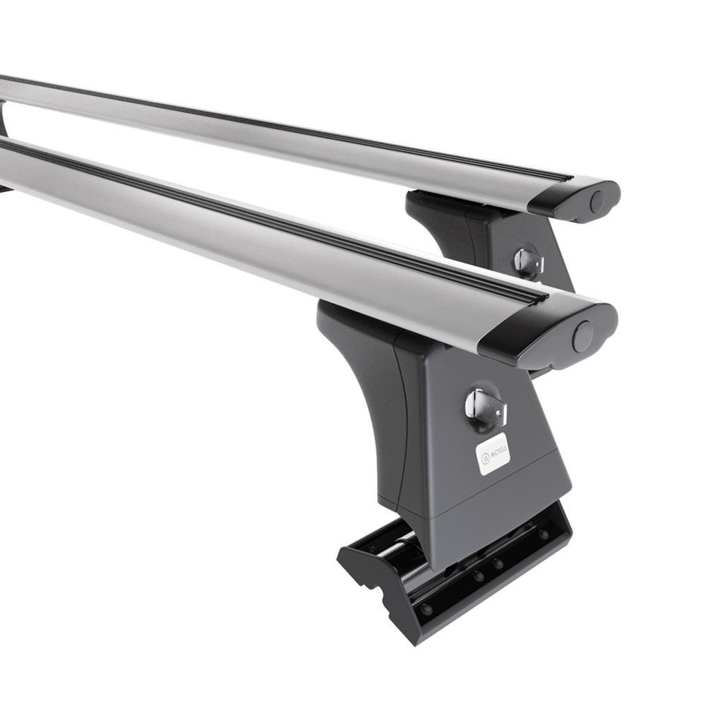 - Le kit de barres de toit se compose de 2 barres en aluminium solides ainsi que de 4 prises (appelé aussi patte), qui s’adaptent au type de toit ainsi qu’au modèle ou à la génération de la voiture sélectionnée.