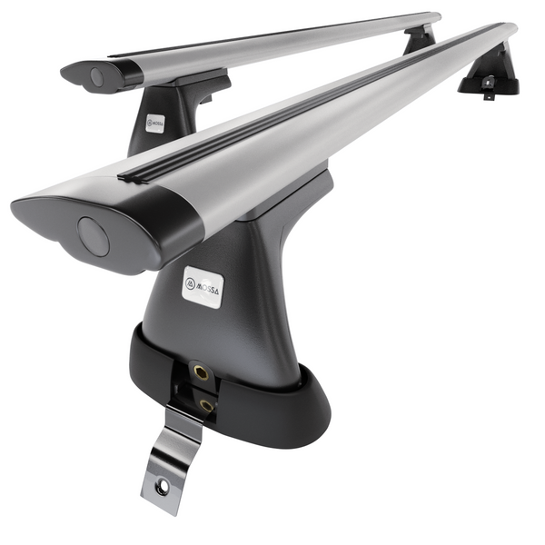 - Le kit de barres de toit se compose de 2 barres en aluminium solides ainsi que de 4 prises (appelé aussi patte), qui s’adaptent au type de toit ainsi qu’au modèle ou à la génération de la voiture sélectionnée.