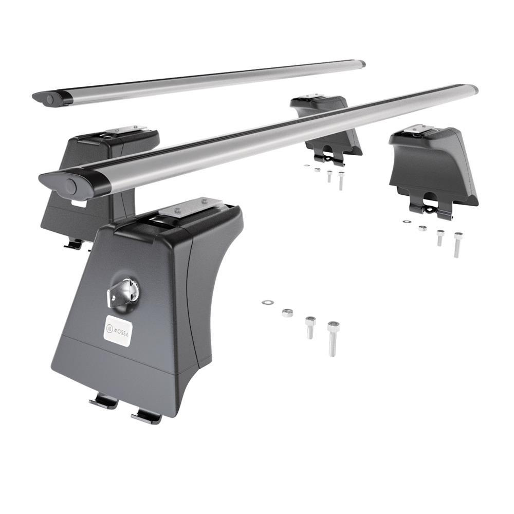 - Le kit de barres de toit se compose de 2 barres en aluminium solides ainsi que de 4 prises (appelé aussi patte), qui s’adaptent au type de toit ainsi qu’au modèle ou à la génération de la voiture sélectionnée.