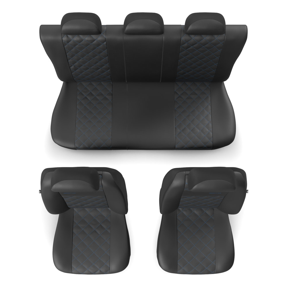 - Les housses sont en similicuir noir résistant et antitache, avec un matelassage décoratif au centre bleu. Les housses avant sont également ornées de broderies.