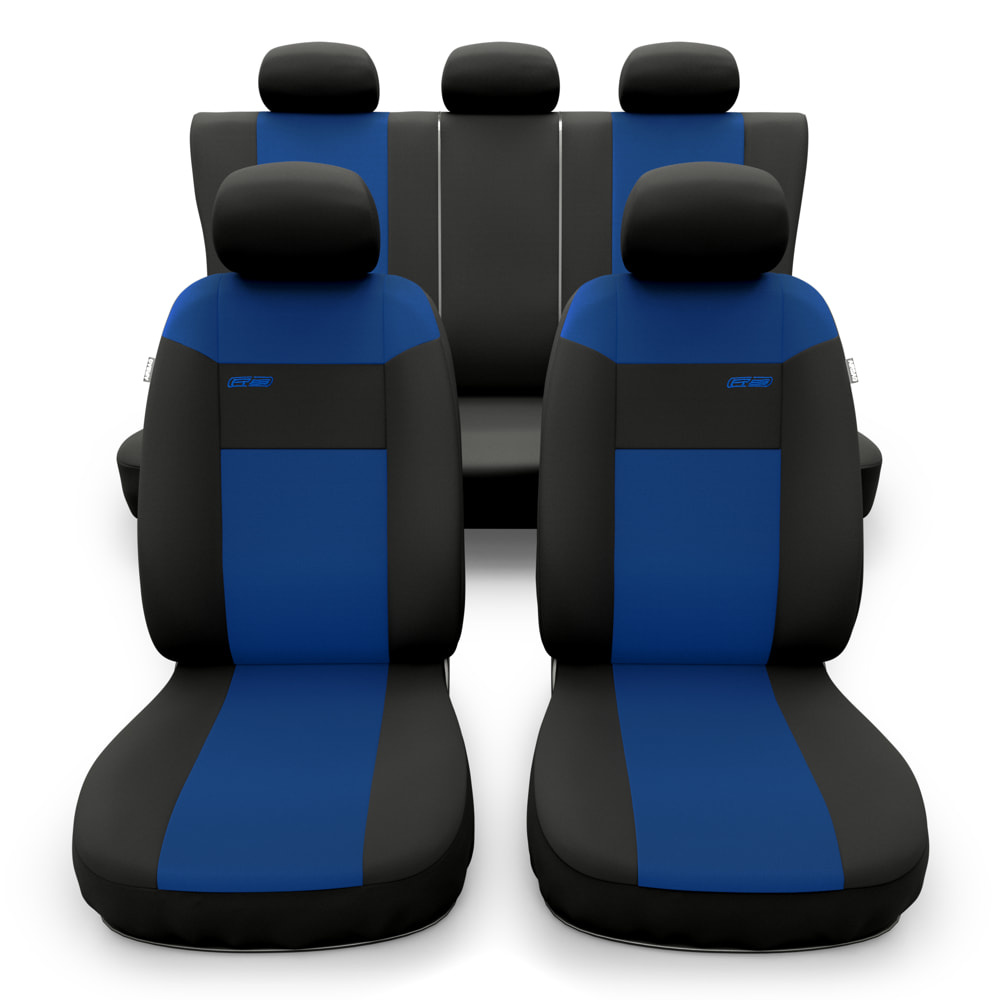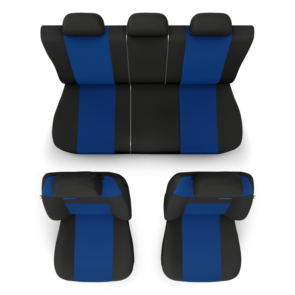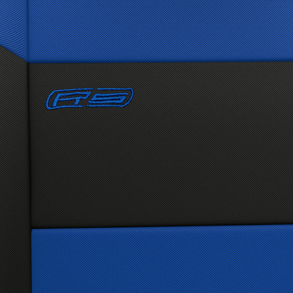 - Les housses sont en tissu de tapisserie noir, avec une partie centrale en maille bleu. Elles arborent également une broderie sportive sur le devant.