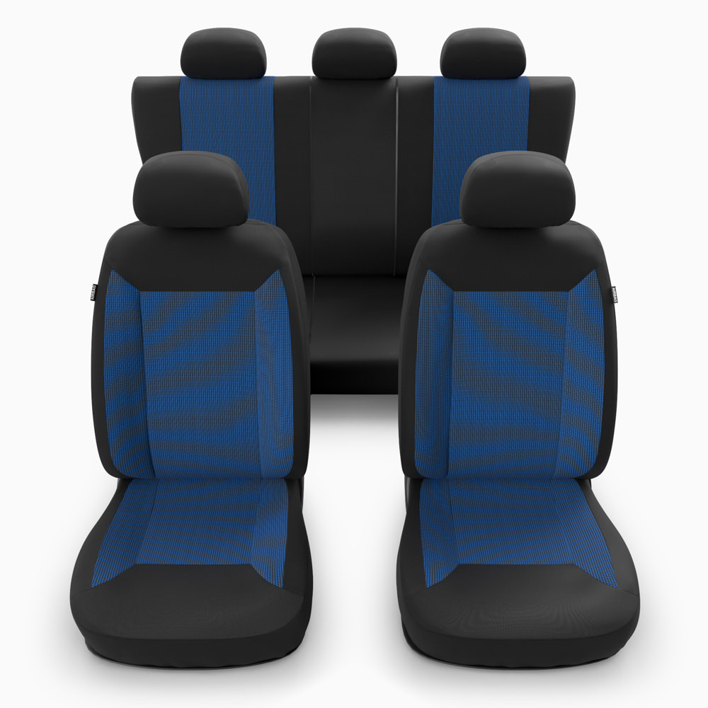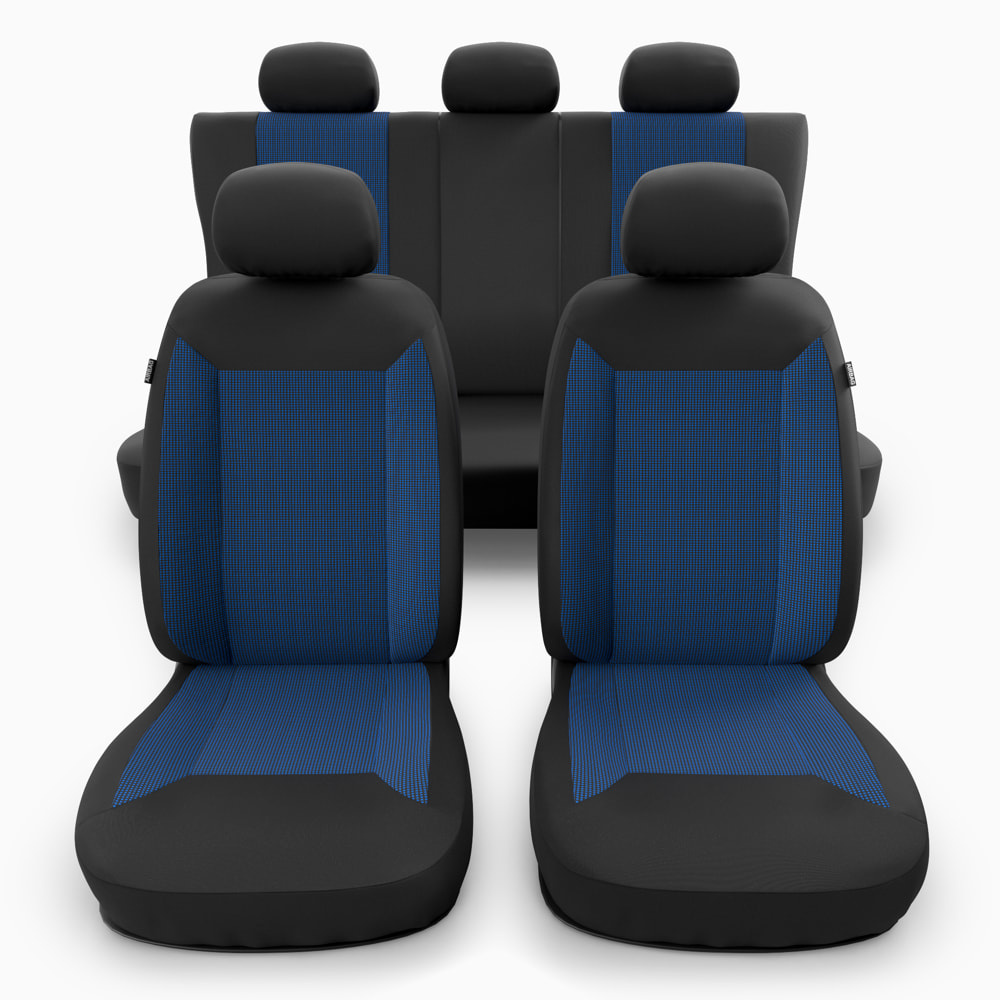 - Les housses sont en tissu de tapisserie noir avec un empiècement jacquard bleu au centre.