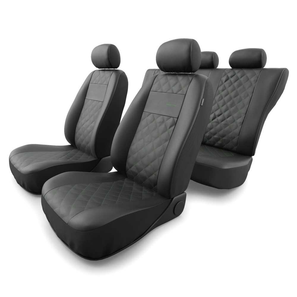 - Les housses sont en similicuir noir résistant et antitache, avec un matelassage décoratif au centre vert. Les housses avant sont également ornées de broderies.