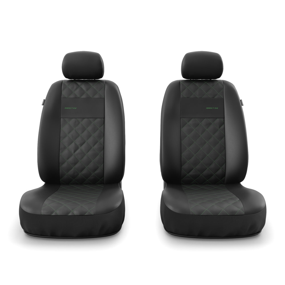- Les housses sont en similicuir noir résistant et antitache, avec un matelassage décoratif au centre vert. Les housses avant sont également ornées de broderies.