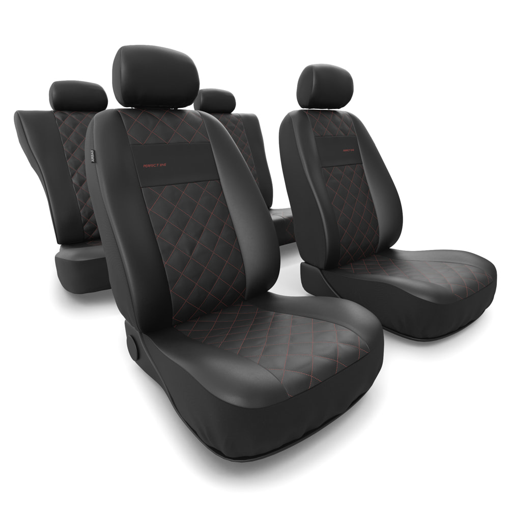 - Les housses sont en similicuir noir résistant et antitache, avec un matelassage décoratif au centre rouge. Les housses avant sont également ornées de broderies.