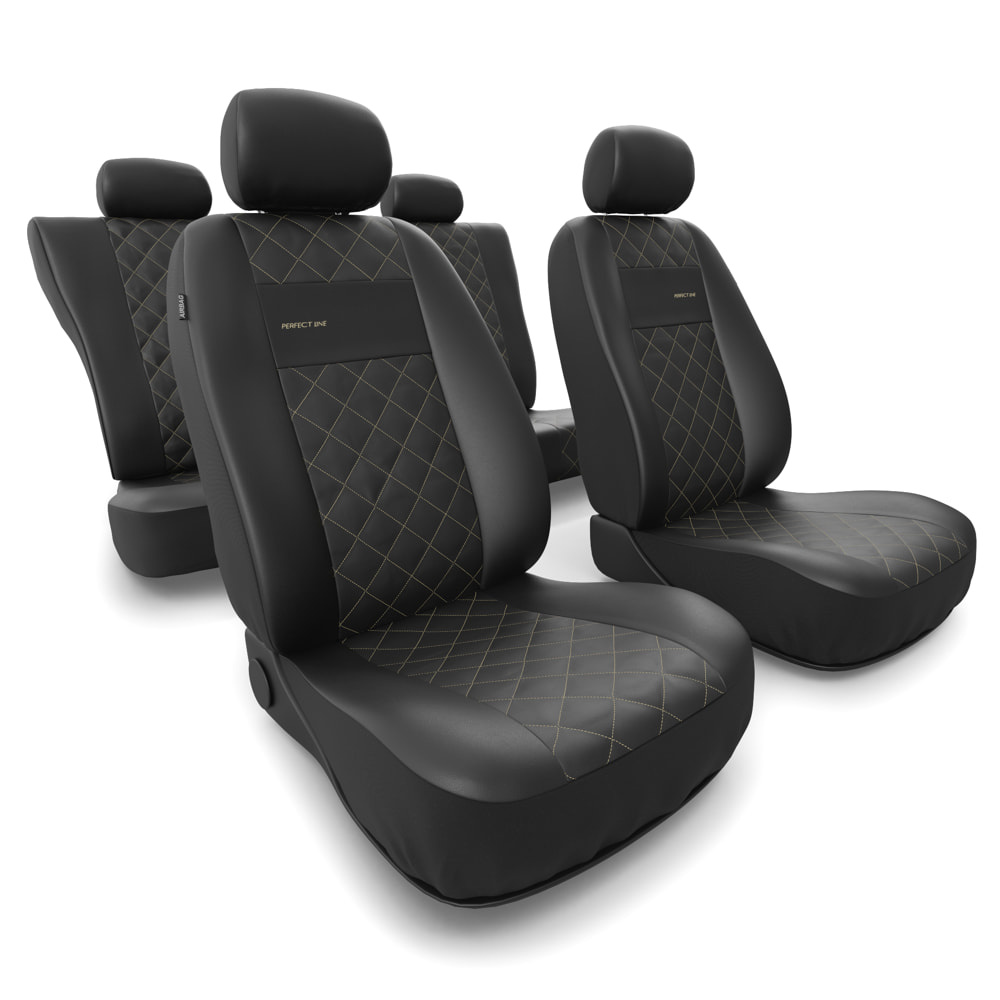 - Les housses sont en similicuir noir résistant et antitache, avec un matelassage décoratif au centre beige. Les housses avant sont également ornées de broderies.