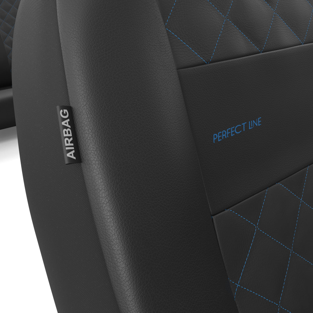 - Les housses sont en similicuir noir résistant et antitache, avec un matelassage décoratif au centre bleu. Les housses avant sont également ornées de broderies.