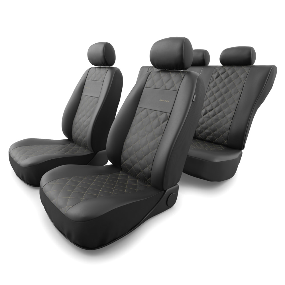 - Les housses sont en similicuir noir résistant et antitache, avec un matelassage décoratif au centre beige. Les housses avant sont également ornées de broderies.