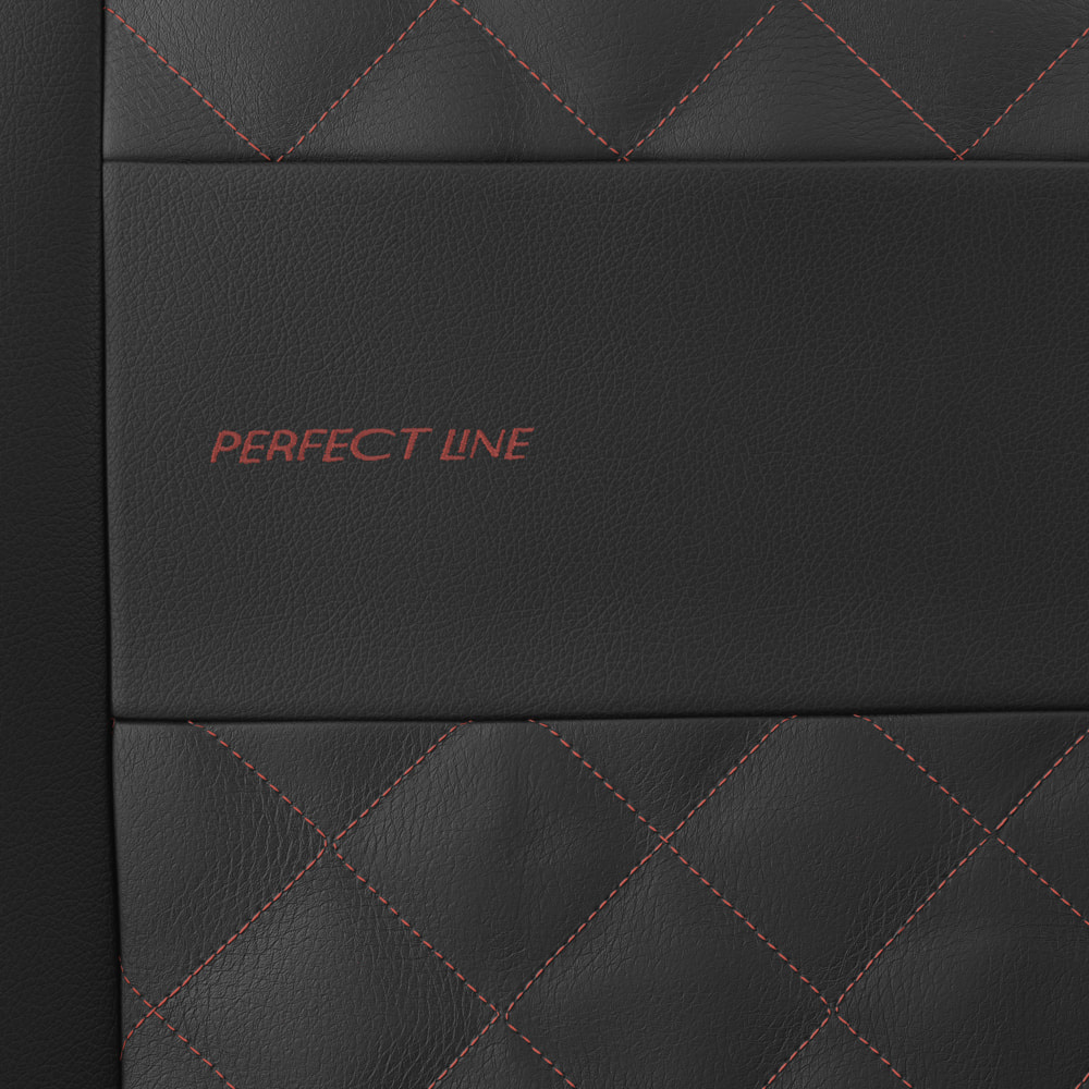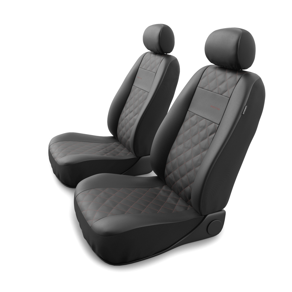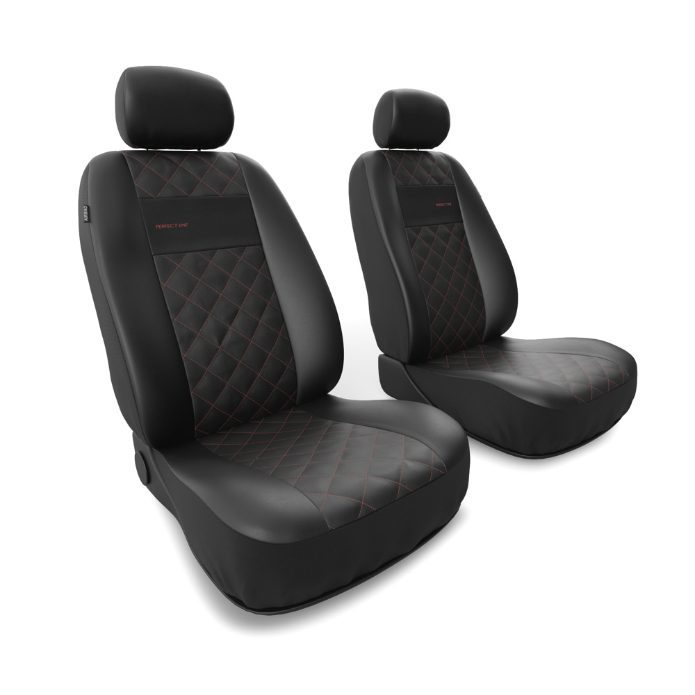 - Les housses sont en similicuir noir résistant et antitache, avec un matelassage décoratif au centre rouge. Les housses avant sont également ornées de broderies.