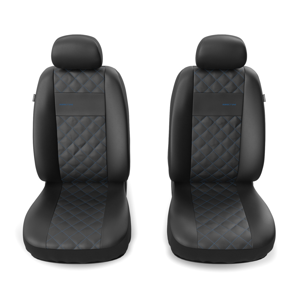 - Les housses sont en similicuir noir résistant et antitache, avec un matelassage décoratif au centre bleu. Les housses avant sont également ornées de broderies.