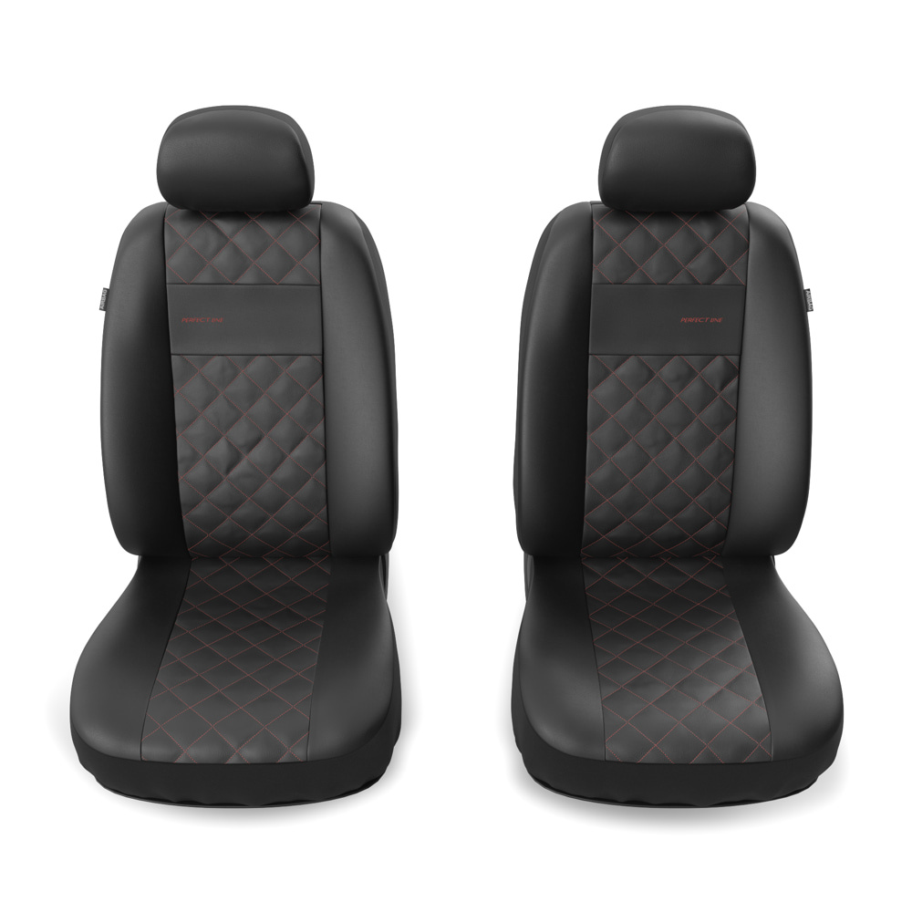 - Les housses sont en similicuir noir résistant et antitache, avec un matelassage décoratif au centre rouge. Les housses avant sont également ornées de broderies.