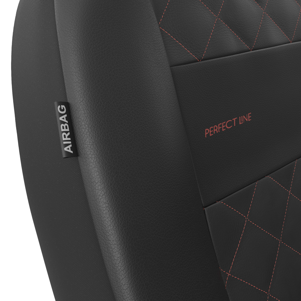 - Les housses sont en similicuir noir résistant et antitache, avec un matelassage décoratif au centre rouge. Les housses avant sont également ornées de broderies.