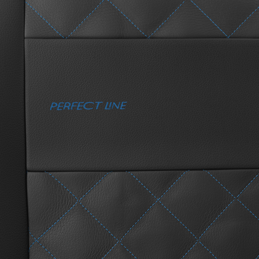 - Les housses sont en similicuir noir résistant et antitache, avec un matelassage décoratif au centre bleu. Les housses avant sont également ornées de broderies.