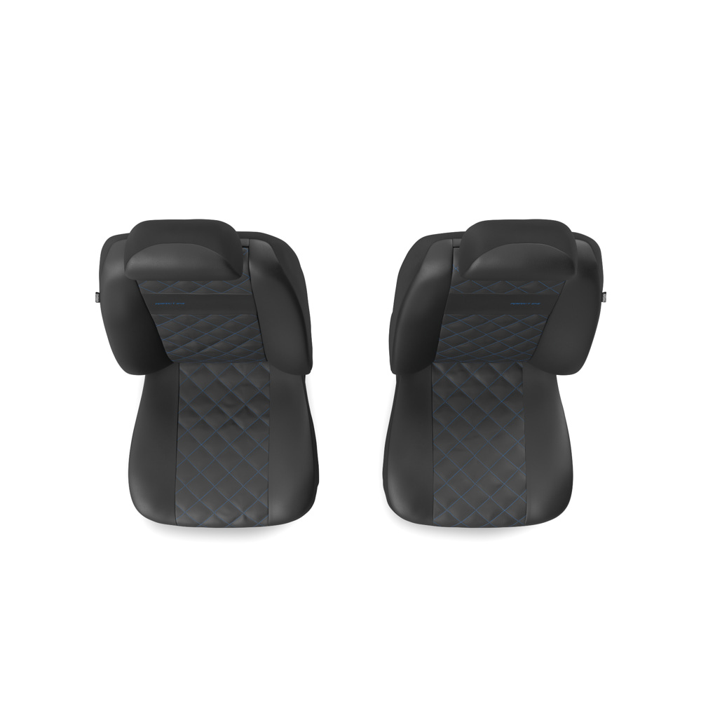 - Les housses sont en similicuir noir résistant et antitache, avec un matelassage décoratif au centre bleu. Les housses avant sont également ornées de broderies.