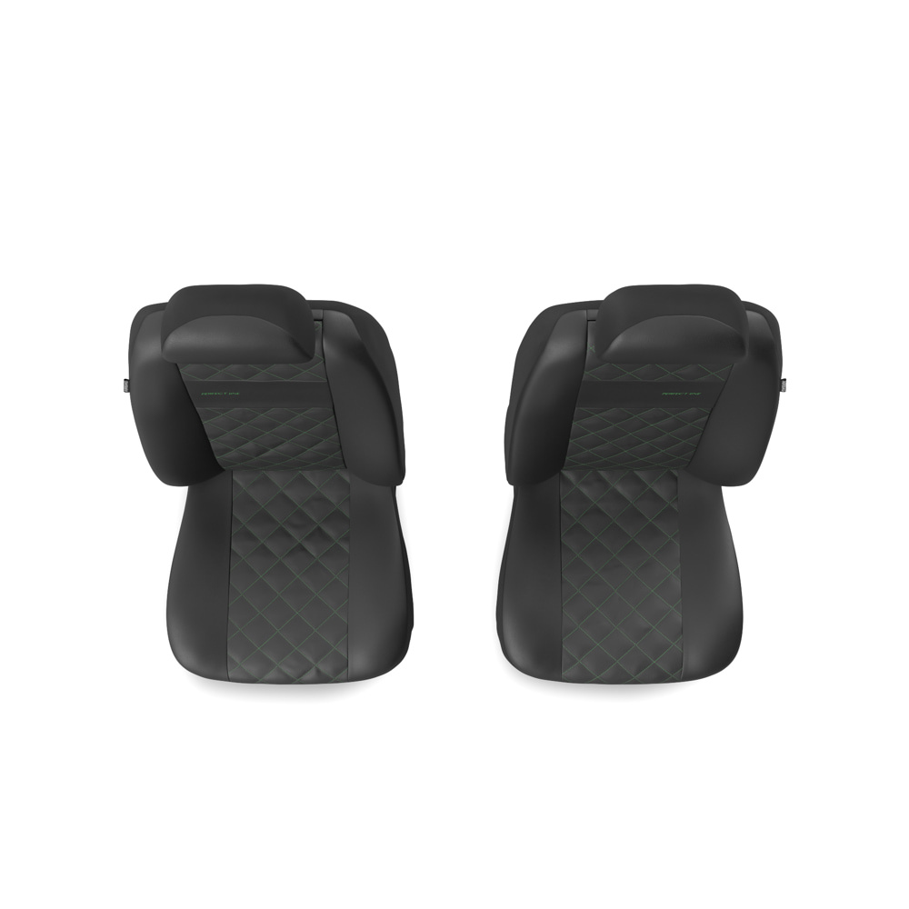 - Les housses sont en similicuir noir résistant et antitache, avec un matelassage décoratif au centre vert. Les housses avant sont également ornées de broderies.