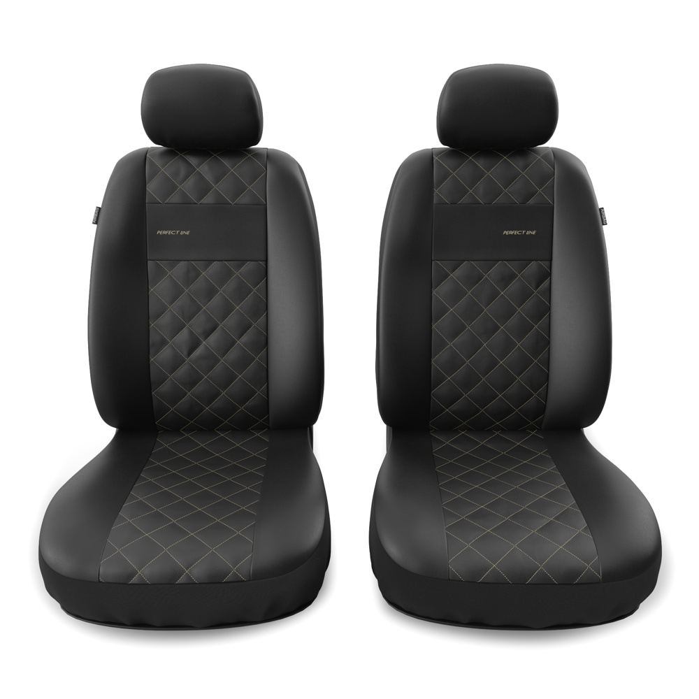- Les housses sont en similicuir noir résistant et antitache, avec un matelassage décoratif au centre beige. Les housses avant sont également ornées de broderies.