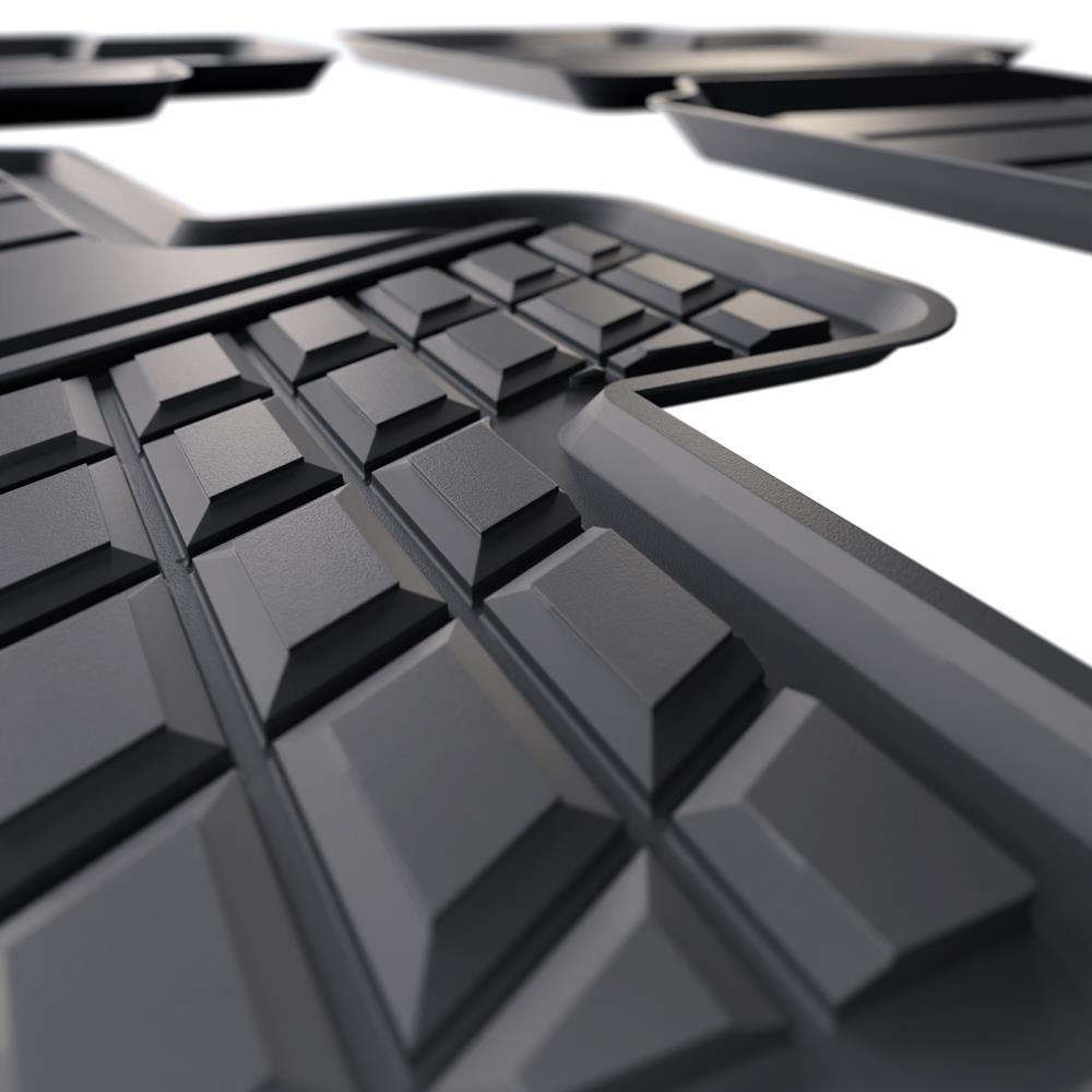 - Un ajustement parfait au sol et les fixations utilisées en fonction du modèle de voiture empêchent les tapis de bouger pendant la conduite. La production de tapis est réalisée selon les normes de qualité les plus élevées, et les matériaux utilisés pour leur production sont sans danger pour la santé et sont recyclables. Les tapis sont imperméables et faciles à nettoyer (ils peuvent être nettoyés à l'eau courante, également avec un nettoyeur haute pression).